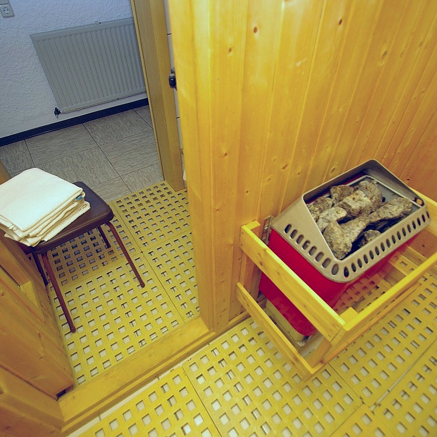 Sie befindet sich im Keller des Wohnhauses. Bis zu 6 Personen können gleichzeitig saunieren. Ein Aufgussofen ist vorhanden. Die Dusche befindet sich gleich neben der Sauna. Zum Abkühlen können Sie das Freigelände nutzen, was nicht einsehbar ist. Zum Entspannen können Sie unseren Hobbyraum als Ruheraum nutzen. Alternativ steht Ihnen der Garten zur Verfügung.